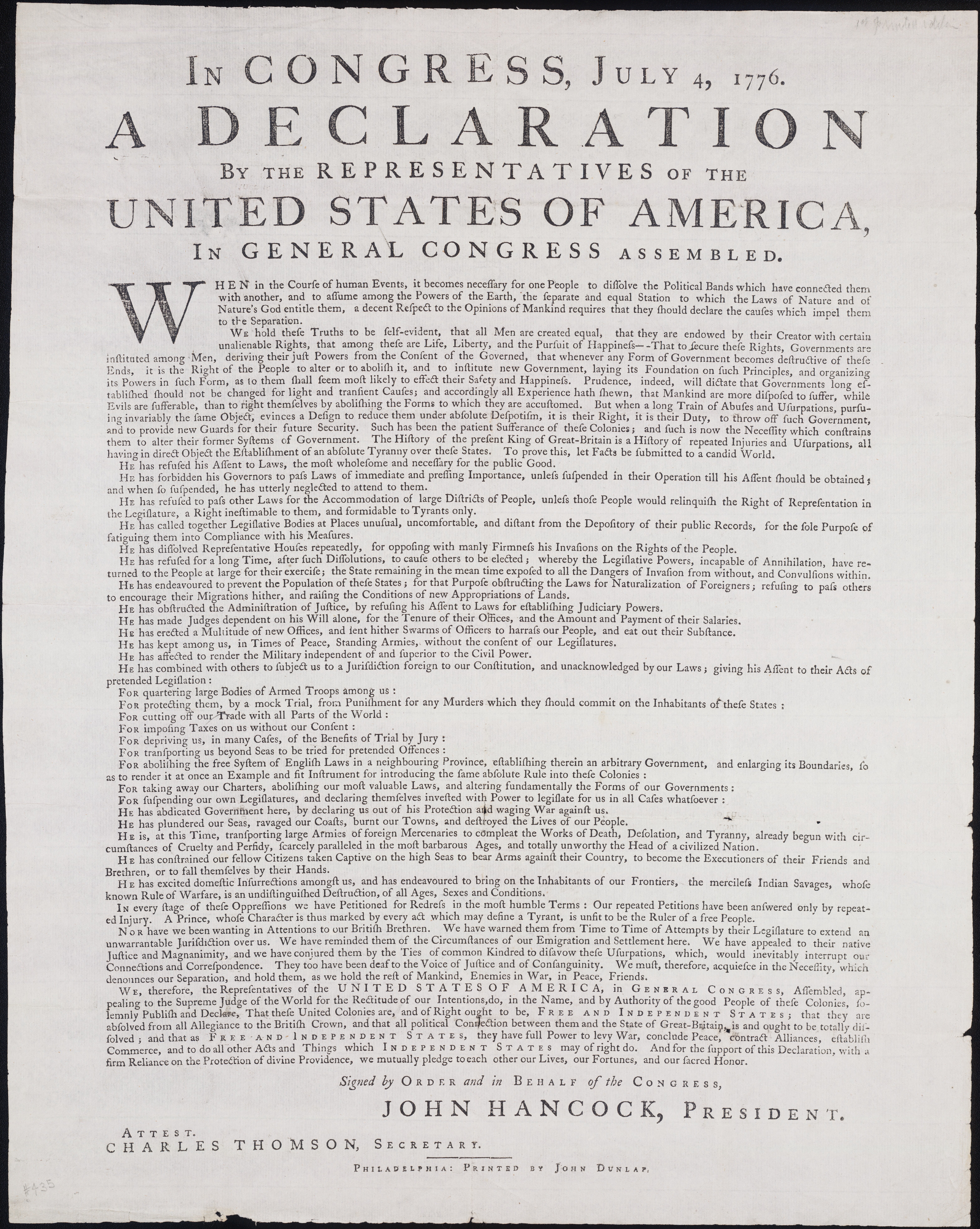 We hold these Truths to be self-evident, that all Men are created equal, that they are endowed by their Creator with certain unalienable Rights, that among these are Life, Liberty, and the Pursuit of Happiness. — That to secure these Rights, Governments are instituted among Men, deriving their just Powers from the Consent of the Governed, that whenever any Form of Government becomes destructive of these Ends, it is the Right of the People to alter or to abolish it, and to institute new Government, laying its Foundation on such Principles, and organizing its Powers in such Form, as to them shall seem most likely to effect their Safety and Happiness. Prudence, indeed, will dictate that Governments long established should not be changed for light and transient Causes; and accordingly all Experience hath shewn, that Mankind are more disposed to suffer, while Evils are sufferable, than to right themselves by abolishing the Forms to which they are accustomed. But when a long Train of Abuses and Usurpations, pursuing invariably the same Object, evinces a Design to reduce them under absolute Despotism, it is their Right, it is their Duty, to throw off such Government, and to provide new Guards for their future Security. Such has been the patient Sufferance of these Colonies; and such is now the Necessity which constrains them to alter their former Systems of Government. The History of the present King of Great-Britain is a History of repeated Injuries and Usurpations, all having in direct Object the Establishment of an absolute Tyranny over these States. To prove this, let Facts be submitted to a candid World.